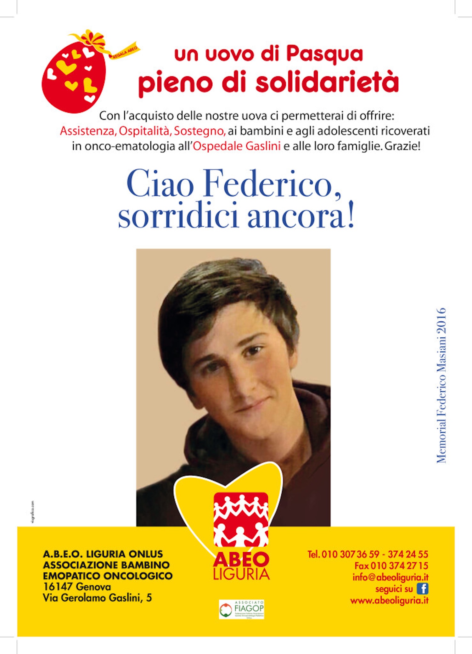 La mamma Laura, il fratello Roberto, i nonni e gli amici, in memoria di Federico Masiani, scomparso il 2 dicembre 2015, desiderano, per gratitudine e solidarietà, dare un sostegno all’Associazione Abeo:“bambino emopatico oncologico” all’Ospedale Gaslini di Genova. L’Associazione, dal 1982, opera per dare accoglienza e ospitalità, assistenza domiciliare ai bambini malati e alle loro famiglie.